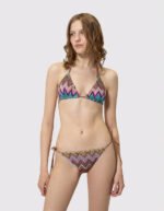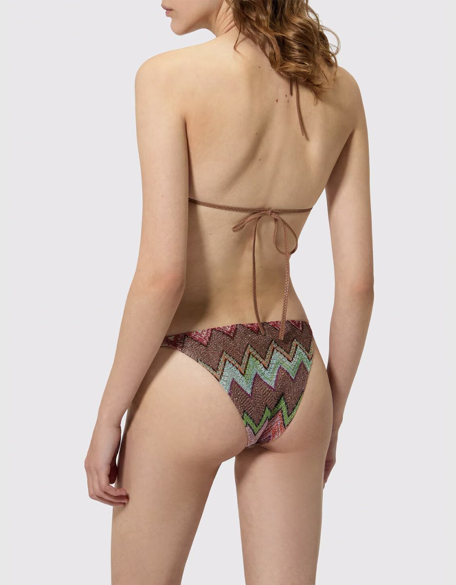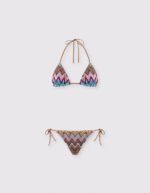 Un bikini a triangolo da donna realizzato in viscosa lamé, caratterizzato dal motivo macro zig zag e da laccetti regolabili. La costruzione valorizza la silhouette, dando vita a un modello di beachwear luminoso e armonioso.